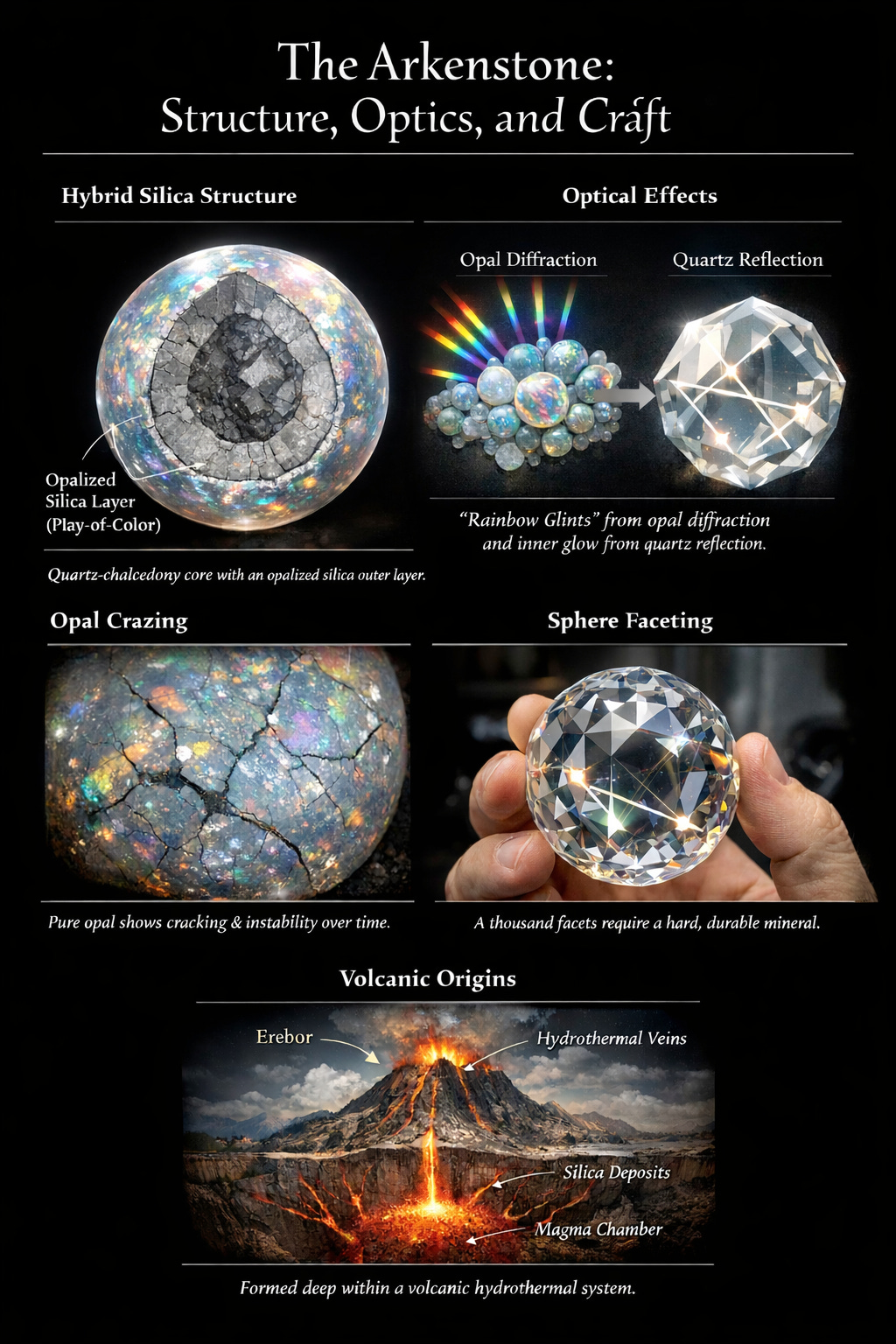 Geologist’s Note: A softball-sized, micro-faceted pure opal sphere is impossible with known materials. But a hybrid silica structure (opal-rich surface on a quartz or chalcedony core) could deliver opal’s fireworks with quartz’s backbone, especially if ancient Dwarven craft included techniques to stabilize water content and heal micro-fractures during cutting and annealing. That’s the most believable route to Tolkien’s optics, shape, and durability in a single stone.