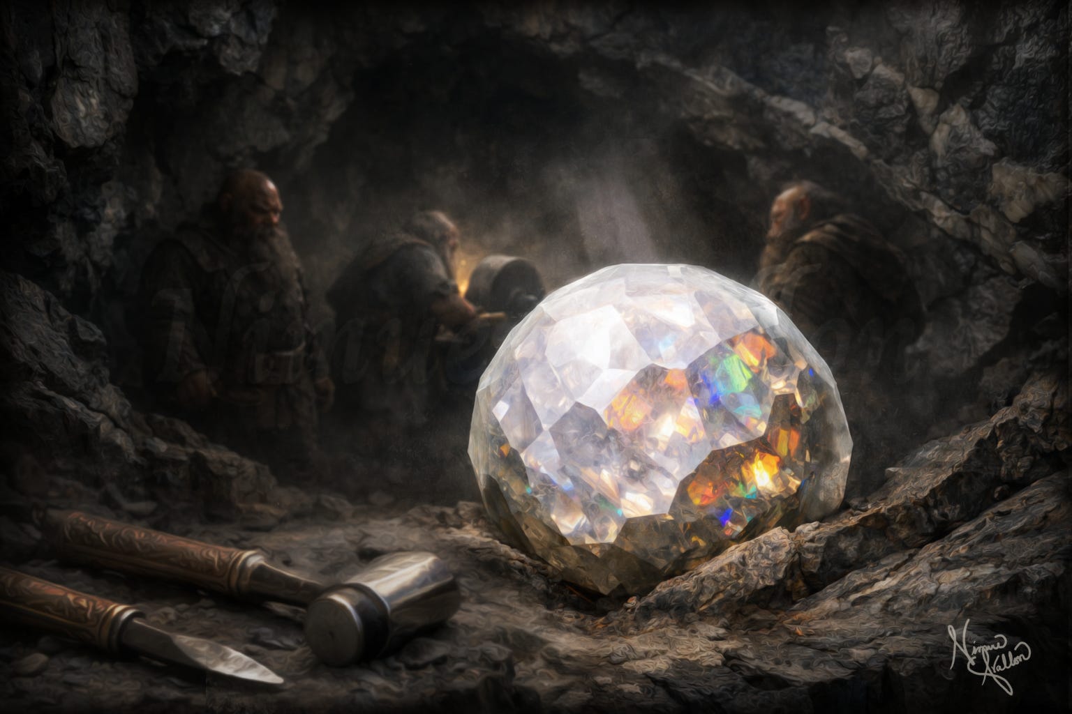 The lore supports this reading. The Dwarves worked stone through song and understood how mountains rang under the hammer. This wasn’t poetry, it was technique. They knew which tones steadied the stone and which would shatter it. Combined with methods to stabilize water content in the opal layers, controlled annealing to heal micro-fractures, and the luxury of time measured in years rather than billing hours, such craft could achieve what modern economics discourages: a softball-sized, densely faceted sphere of hybrid silica that survived millennia without crazing or fracture.